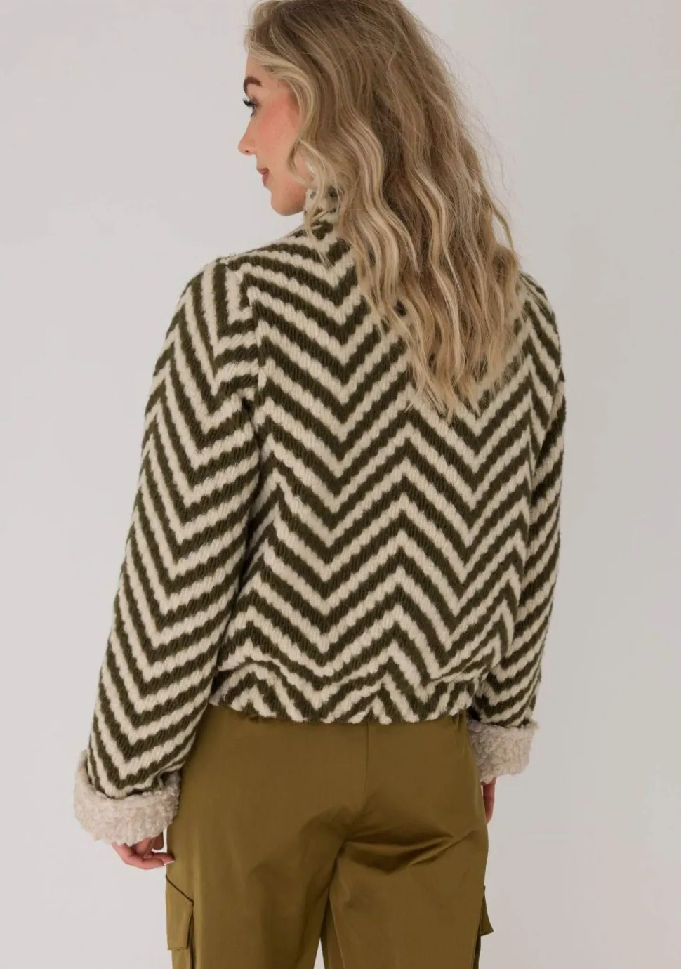 – Het model is 1.76m lang en draagt maat S