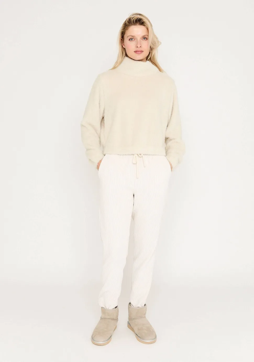 – Het model is 1.76m lang en draagt maat S