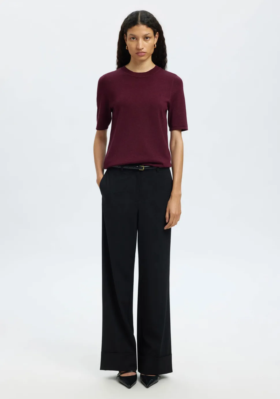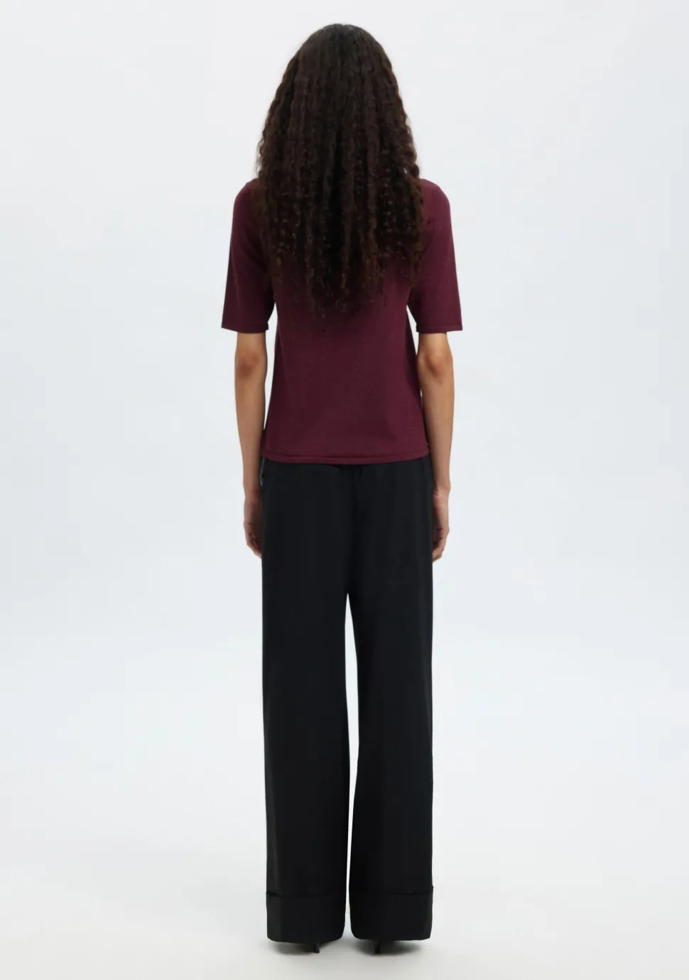 – Het model is 1.76m lang en draagt maat S