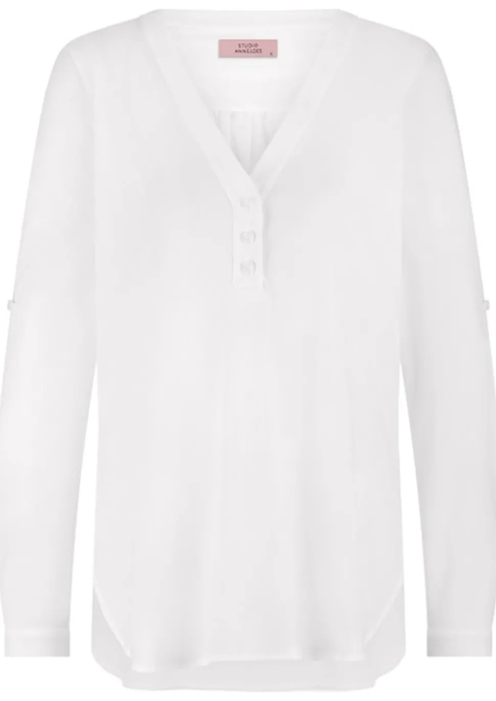 Wat deze blouse extra handig maakt, zijn de opknoopbare mouwen. Hierdoor kun je de Evi Blouse zowel met lange als opgerolde mouwen dragen, afhankelijk van het seizoen of de gelegenheid. De blouse sluit met knopen en heeft een lengte van 73 cm vanaf de schouder, waardoor hij net wat langer valt en mooi te combineren is met zowel een strakke broek als een legging. Het model op de foto is 1.78 meter lang en draagt maat S, zodat je een goed beeld krijgt van de pasvorm.