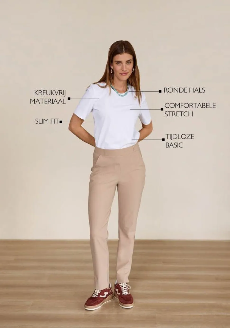 Met zijn ronde hals biedt het Travel Tee een klassieke uitstraling die gemakkelijk te combineren is met zowel casual als geklede outfits. De getailleerde pasvorm zorgt ervoor dat het shirt mooi aansluit op je lichaam, zonder te strak te zitten. Het effen ontwerp maakt dit shirt tijdloos en veelzijdig, waardoor het een must-have is voor elke modebewuste vrouw.