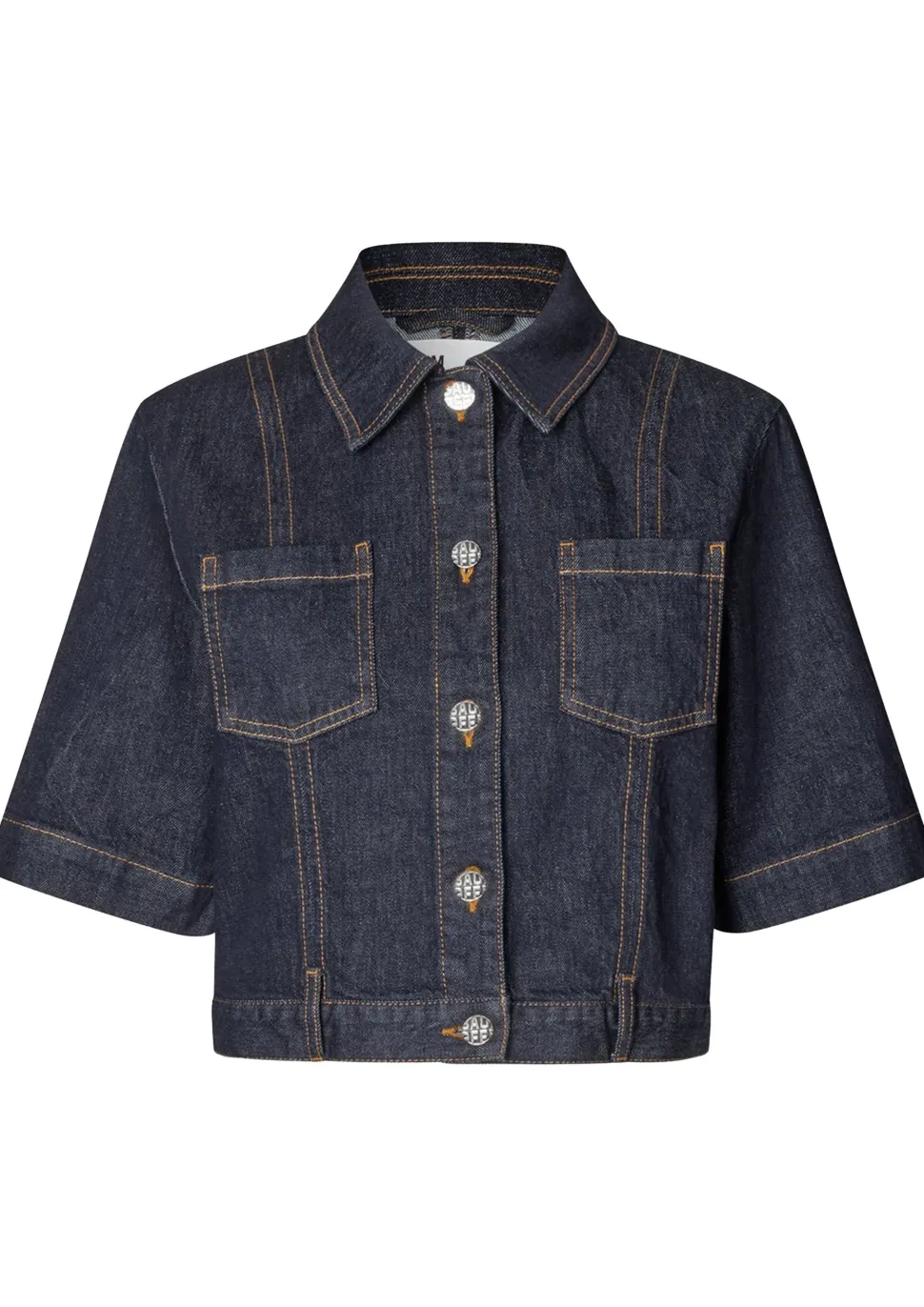 – NO 05 denim jacket met een cropped fit. Is voorzien van borstzakken en riemlussen aan de onderzijde.