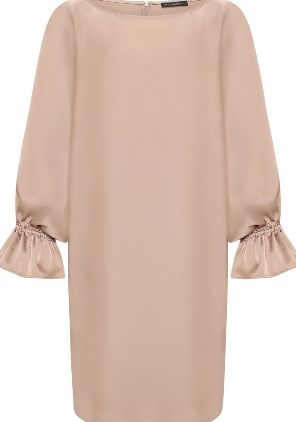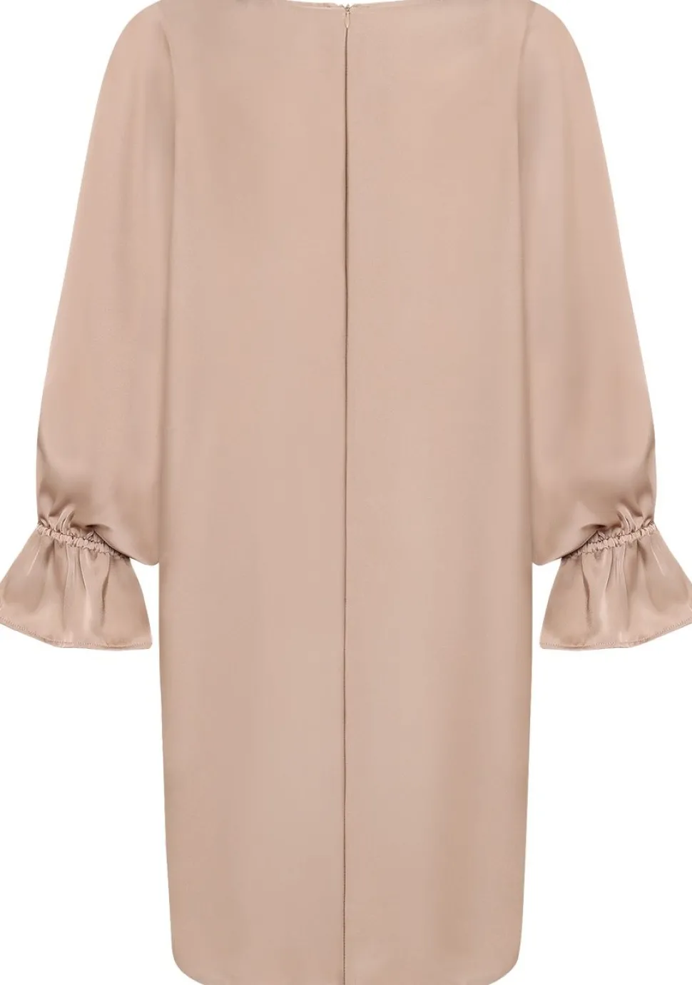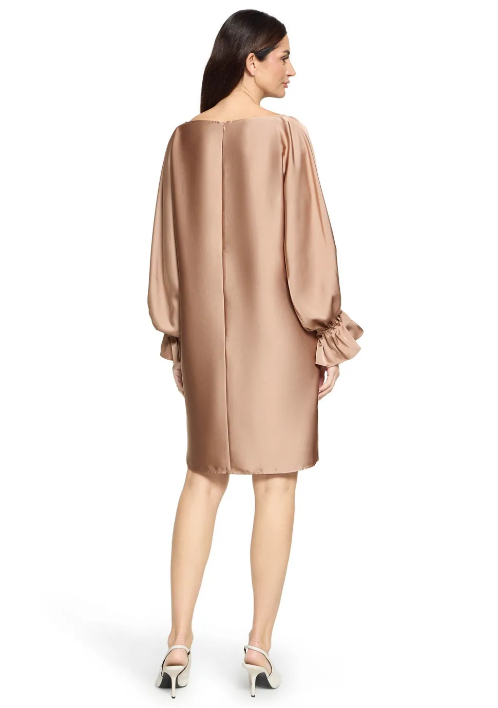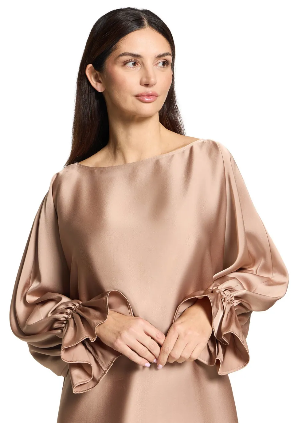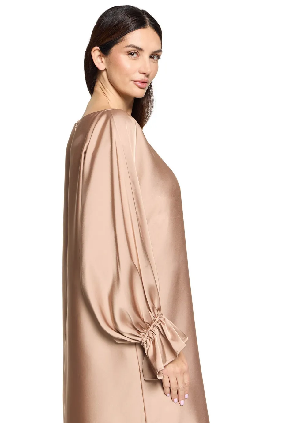 – De satijnen jurk is afgewerkt met ballon mouwen