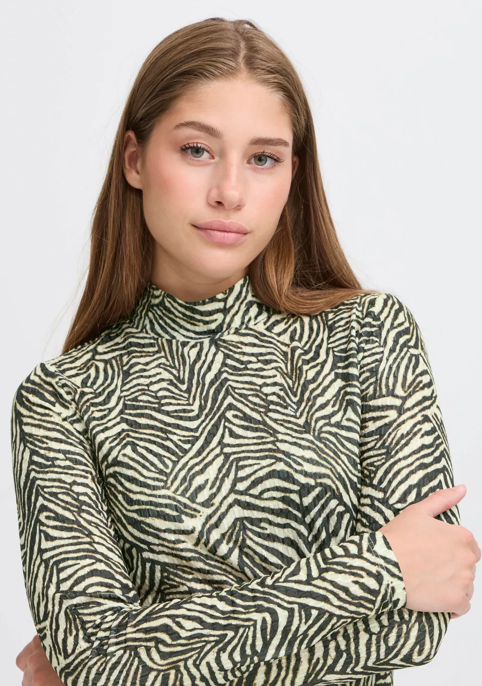 – Het model is 1.76m lang en draagt maat S