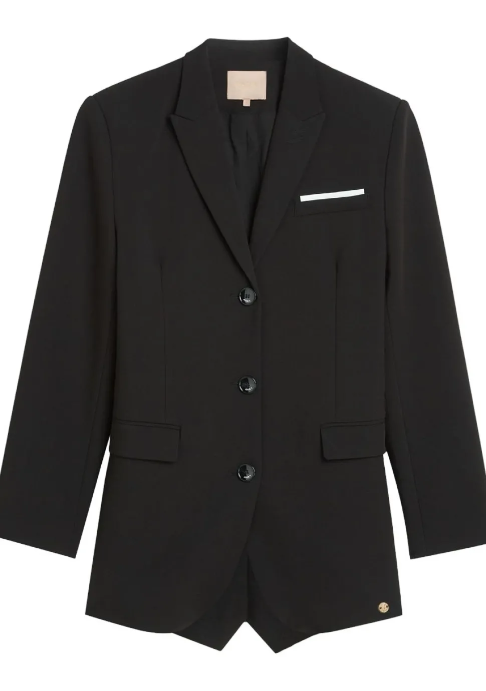 – De blazer is voorzien van klepzakken en schoudervulling. De achterzijde van de blazer is afgewerkt met elastisch detail, wat zorgt voor een getailleerde pasvorm