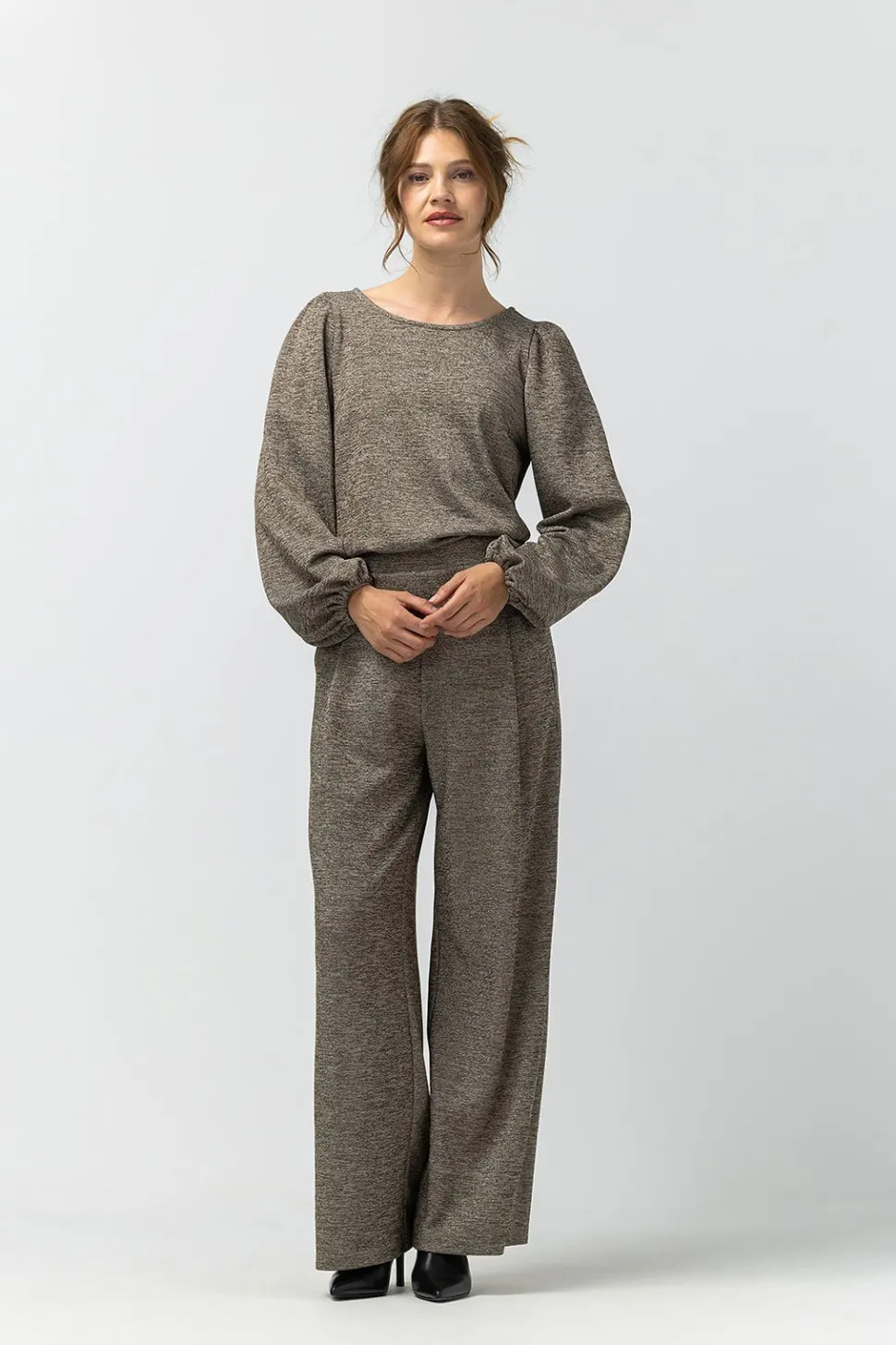 – Riet pantalon afgewerkt met een subtiel glitter detail. De pantalon is afgewerkt met steekzakken.