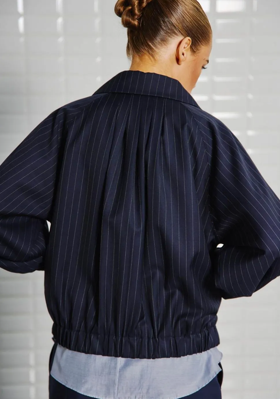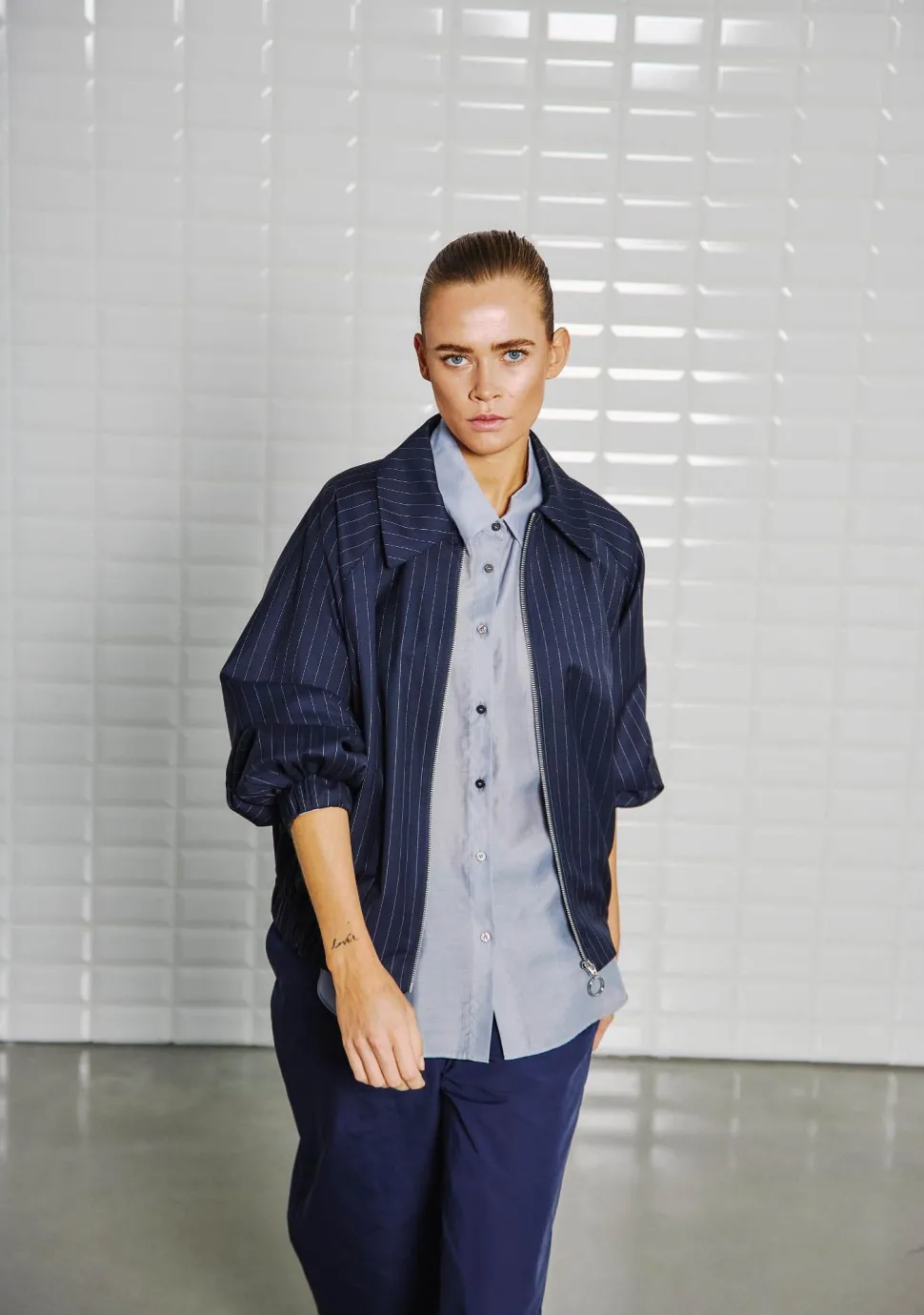 – Het model is 1.76m lang en draagt maat S